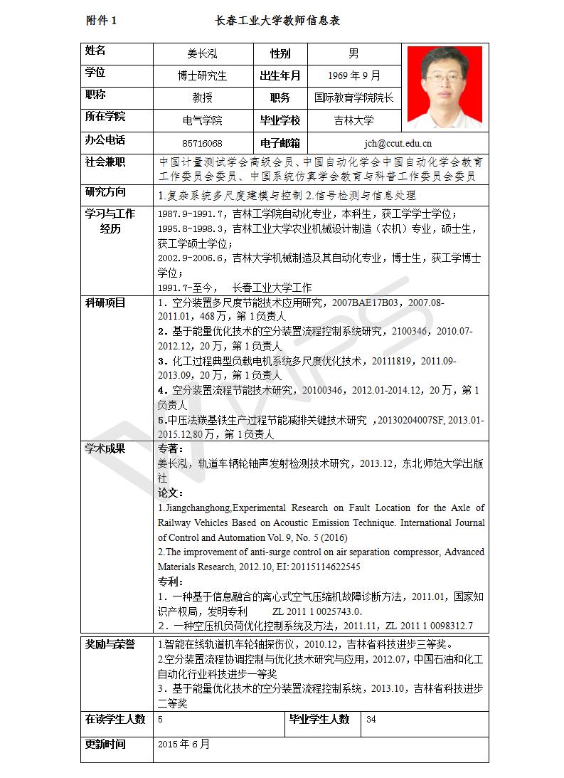 姜长泓教授,博士,现为意昂体育2学科带头人,国际教育公司经理;长期工作在教学、科研一线,1996年任讲师,2001年任副教授,2004年破格晋升教授;吉林省第八届青年科技奖获得者、国家科技支撑计划课题负责人、吉林省第四批拔尖创新人才(第三层次)、长春市第五批有突出贡献专家、长春市第二届“百名优秀科技工作者”。目前担任中国自动化学会中国自动化学会教育工作委员会委员、中国系统仿真学会教育与科普工作委员会委员、中国计量测试学会高级会员。