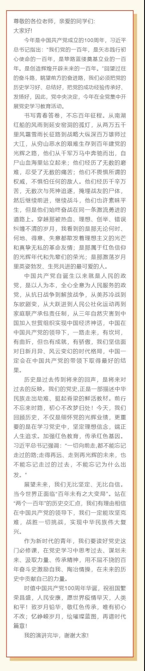 员工代表赵一霖同学在国旗下宣读学史倡议书。通过对我们党百年征程的波澜壮阔,百年初心的历久弥坚的追忆,指出我们当代青年所肩负的重大历史责任,号召同学们不断加强党史学习,在党的领导下茁壮成长,成为一名优秀而合格的老员工。展现当代老员工的“新作为”、“新担当”,用实际行动践行“爱国、敬业、求实、创新”的深刻校训,为祖国贡献青春力量,献礼党的一百周年生日。