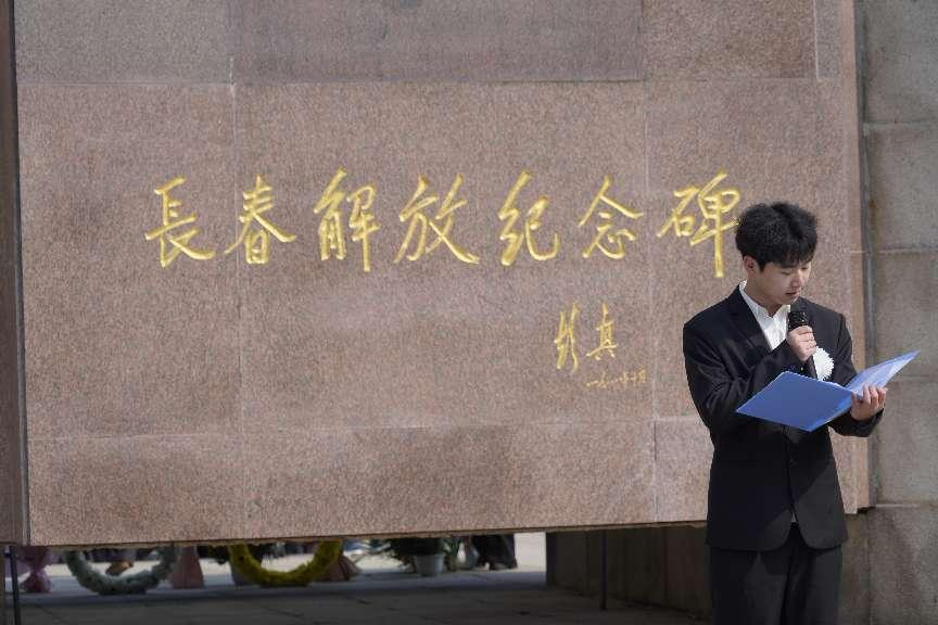 晨光中,蔡颖辉与李若男两位老师垂首肃立,缓步上前将素洁的花束敬献于碑前。晨曦漫过云层,在镌刻着"长春解放纪念碑"的鎏金碑文上漾起微光,花岗岩碑体在薄雾中显出庄重的轮廓。员工们依次列队上前,指尖轻抚过牡丹浮雕底座上凝结的晨露,将鲜嫩的白菊沿着青灰色碑座郑重摆放。