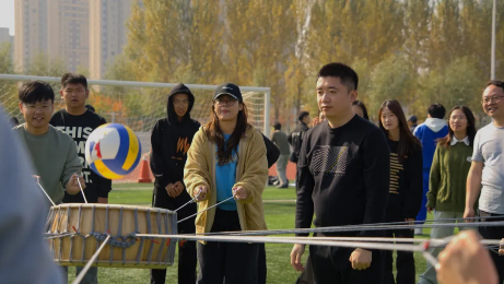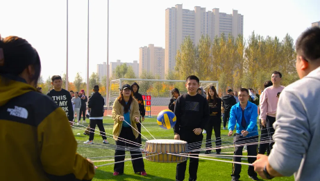 老师们拉紧绳子,神情专注地盯着即将落下的球。球触鼓面,“咚”的一声,拉开了激烈角逐的序幕。老师们齐心协力,随着球的跳动调整力度与方向,口号声整齐响亮。