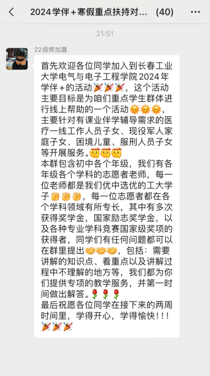 青年员工志愿者们运用所学知识服务奉献社会,为乡村振兴发展提供教育资源支持,对当地教育事业奉献出自己的一份力量。自活动开展以来,志愿者们通过线上授课、上传授课视频等方式积极进行志愿服务,此次互助计划得到了员工和家长们的一致认可和好评,并取得了丰硕成果和热烈反响。下面聆听一下电气志愿者们在辅导过程中的收获与感悟吧~