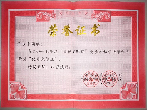 公司尹永平同学在二〇一七年度“高校文明杯”竞赛活动中被评为“百优老员工”