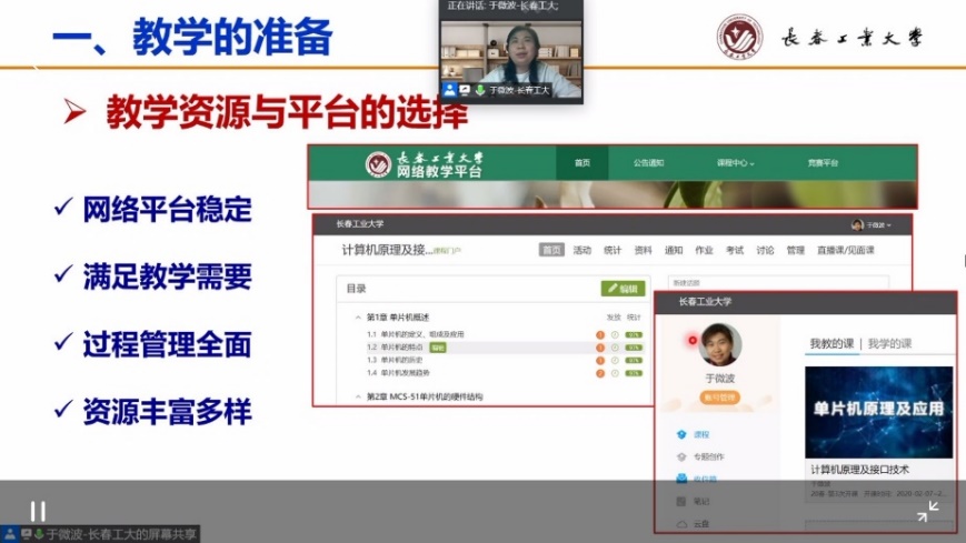 分享会上,于微波老师以本学期讲授的《计算机原理及接口技术》课程为例,从教学准备、教学设计、教学实施、学习评价、收获与思考5个方面,分享了多平台互补,实现高质量网络教学的线上教学经验。