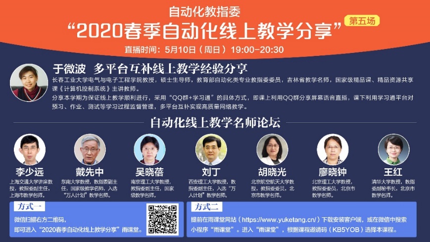 这个春季,由于新冠肺炎疫情,全国高校师生把课堂搬到了“云”上。疫情虽然阻挡了员工新学期返校报到的脚步,却不能阻止员工的求知欲望,更不能阻挡老师传道授业解惑的脚步。当前,期中已过、期末在即,各省市高校回校复课安排不一,很多老师正面对新一轮问题:线上-线下教学如何有效衔接?全过程线上教学如何提高学习成效?实验实践环节在线学习如何保证课程目标达成?教育部自动化教指委为此举办了“2020春季自动化线上教学分享系列会”。公司于微波教授受邀参加此次分享会。