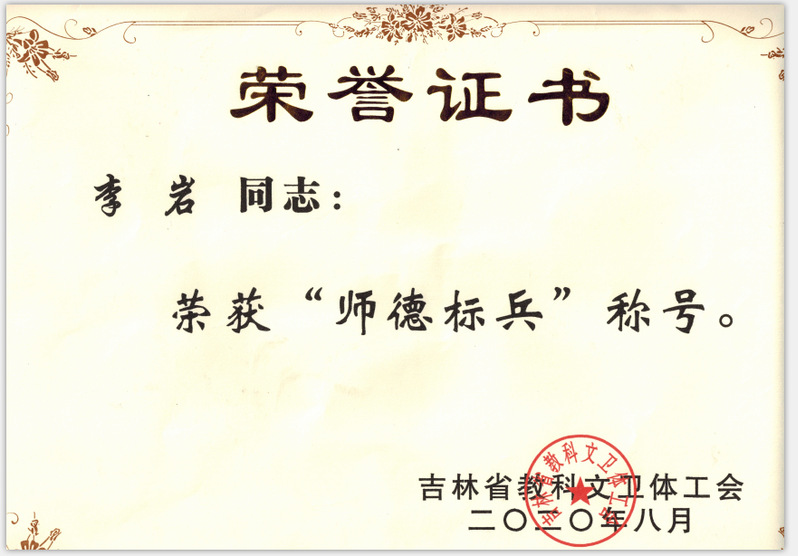 为深入贯彻落实习近平新时代中国特色社会主义思想,按照吉林省教科文卫体系统“扬正气、树行风,争做职业道德标兵”的活动精神,公司党委多方位、多层次强化教职工思想政治教育,深化师德师风建设,坚定理想信念,弘扬和践行社会主义核心价值观,引导和激励教职员工树立“不忘初心、牢记使命”的责任意识和弘扬高尚的职业道德风尚,取得了丰硕成果。李岩老师在全省教科文卫体系统开展了“扬正气、树行风,争做职业道德标兵”活动中荣获“师德标兵”荣誉称号。