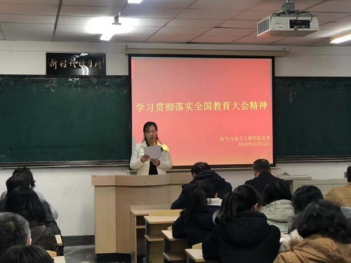 本网讯(通讯员鲍禹松)为全面准确把握全国教育大会的战略精神,贯彻落实公司党委要求。12月12日下午,公司党委在南湖校区1401室召开全院教师大会,专题学习贯彻落实全国教育大会精神。公司党委副书记李雁冰、科研处处长刘克平出席大会,公司全体教师参加。会议由公司党委书记王丽娜主持。