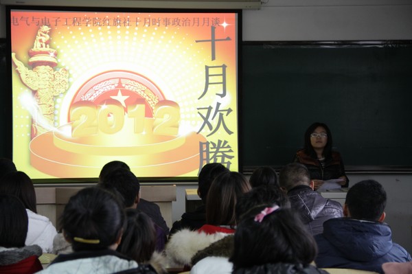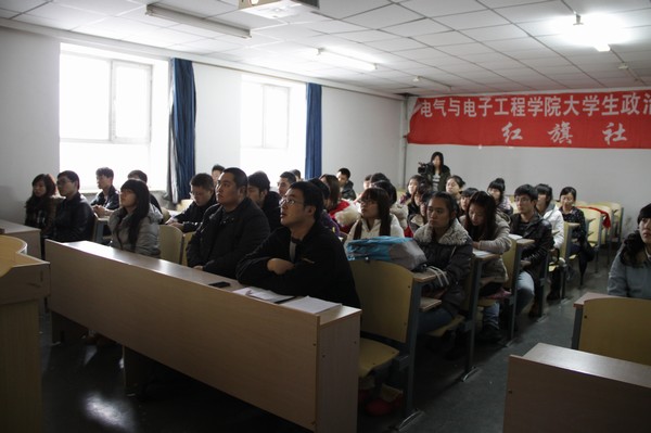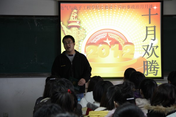 | (通讯员 史梦婷)11月12日12:30红旗社于教学主楼1401室展开了时事政治月月谈之十月欢腾的政治思想学习活动。员工党支部书记郑洪斌、团委书记赵爽出席了本次活动。