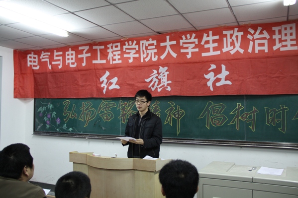 | 公司红旗社开展“弘扬雷锋精神,倡树时代新风”交流会 为了更好地学习雷锋精神,公司红旗社于3月4日在南湖校区主楼1401室开展了主题为“弘扬雷锋精神,倡树时代新风”交流会。出席此次活动的有公司员工党支部书记郑洪斌、员工辅导员朱博老师、红旗社社长赵健颖、秘书长王建楠、徐乐、各部部长以及09、10级各班团支部成员。