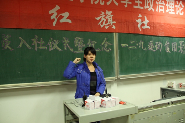 公司举行红旗社新社员入社仪式暨纪念一二.九运动爱国影片教育活动 2010年12月6日晚6点30分,公司红旗社在公司南湖校区科研楼413教室举行新社员入社仪式暨纪念一二·九运动爱国影片教育活动,公司团委副书记、红旗社社长赵健颖及红旗社各部部长出席本次活动。