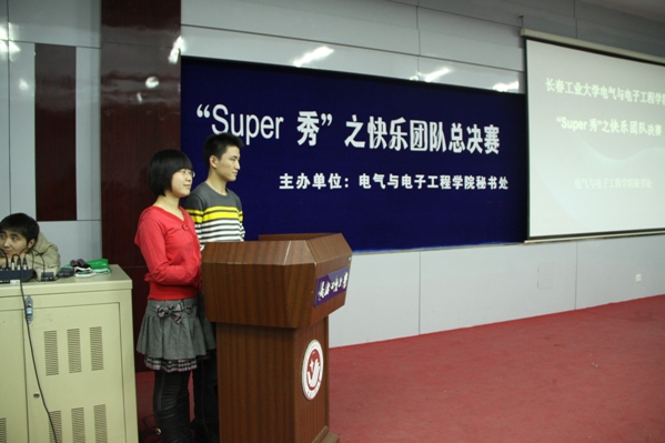 此次活动共分为三个环节,第一环节是“DV大比拼”,由各班展示班级风采,拼的是VCR的搞笑,比的是方队人气。第二环节“才艺你我他”,舞蹈、话剧、歌剧各班选手各显神通。第三环节是“模仿我最棒”,模仿或为名家名段配音,虽然与标准的比起来差远了,但为大家带来了快乐。最终,100311班摘得桂冠,100308﹑100301班分列2﹑3名。最后由嘉宾分别为一﹑二﹑三等奖颁奖。至此本次“Super秀”之快乐团队总决赛圆满结束。