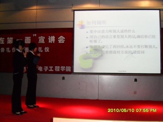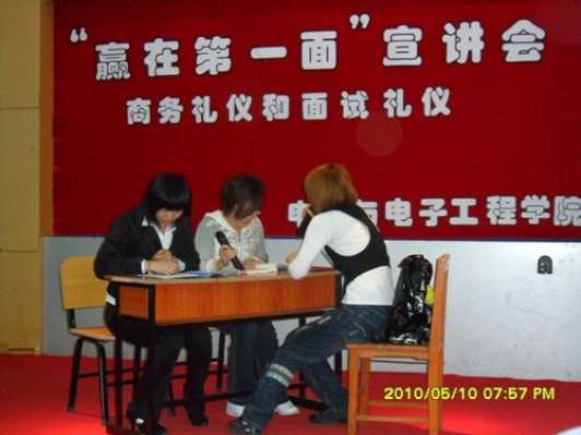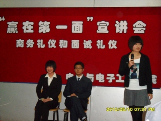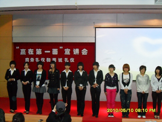 赢在第一面 ——公司举行商务礼仪和面试礼仪宣讲会 2010年5月10日晚7点整,公司在公司南湖校区综合报告厅举办了题为“赢在第一面”——商务礼仪和面试礼仪宣讲会。讲座由公司女生部部长张杨主持。
