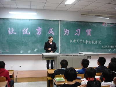 | 2008年10月9日晚6:30,公司在教学科研楼307教室举办学风建设系列活动之“让优秀成为习惯”优秀老员工事迹报告会。公司辅导员赵爽、高博参加了本次报告会。报告会由高博老师主持。 报告会中,050308班邢本东,050303班姜鸣燕,060304班张福厚,070307班陈志娟四名优秀老员工代表以自己的亲生经历从不同的角度告诉在座的新生同学们,只要保持一颗奋斗的雄心,孜孜不倦的付诸行动,优秀并不是梦想,优秀是一种习惯。院社团联合会主席邢本东同学首先上台发言,他重点介绍自己的竞赛经历,竞赛不仅丰富了专业知识,也让同学们在以后的就业竞争中站到一个新的高度。连续四次一等奖学金,国家助学金获得者姜鸣燕让大家明白天道酬勤的真理。张福厚是现任校社团联合会主席,他虽工作任务重,但能很好处理工作与学习的关系,是优秀员工干部的典范。最后一位上台的陈志娟同学,则以自己自立自强的求学之路深深感动和教育了每一位新生,会场一次又一次爆发出热烈的掌声。发言结束后,赵老师给这次报告会做了总结性发言,勉励大家以这四名同学为榜样,努力超越自己,让未来工大为自己而骄傲,报告会在热烈的气氛中圆满结束。 本次报告会是公司学风建设系列活动的重要组成部分,参会同学均受鼓舞和教育。会后,08级新生纷纷表示通过本次活动,更加明确了学习目标,坚定了奋斗信念,大家会以四位学长为榜样,让优秀成为习惯。