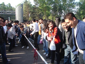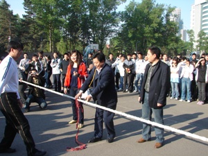 5月6日早6:30,公司“与奥运同行,为奥运喝彩”趣味体育比赛之“齐心协力”拔河比赛在公司南湖校区篮球场开赛。校员工工作处副处长尤海涛为比赛开哨。公司党总支副书记周文军及员工工作办公室全体老师到场为参赛队员加油助威。 伴随尤处长一声哨响,首场拔河比赛在05级11个班级代表队中拉开帷幕。比赛实行淘汰赛和循环赛相结合的赛制,热血澎湃、激情迸发的比赛现场呐喊声、加油声此起彼伏,全体同学都忘我的投入到比赛当中。经过激烈角逐,050301班获得冠军,050302班和050309班分获亚军和季军。