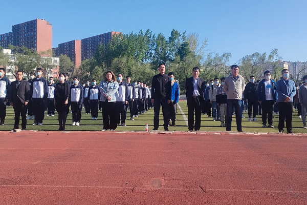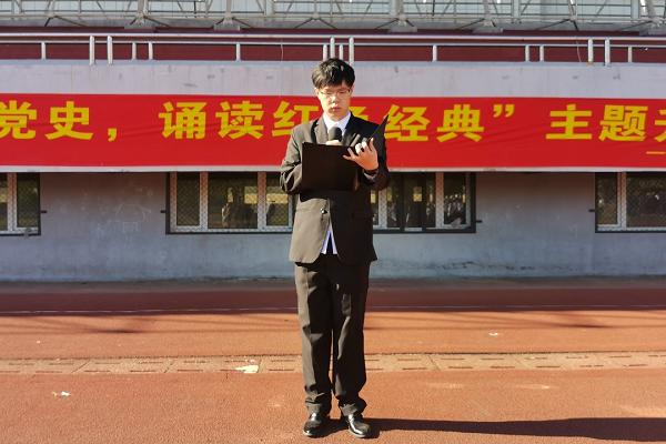 升旗仪式由四名退役老员工担任护旗手,伴随着雄壮的国歌声,在同学们的注视下,五星红旗缓缓升起,迎风飘扬。“青马班”优秀学员卢子旗,代表员工在国旗下承诺,所有同学将继续努力,加强对党史的学习与感悟,用自己的知识和行动为国家的文明富强添砖加瓦,为民族复兴贡献青春和热血。