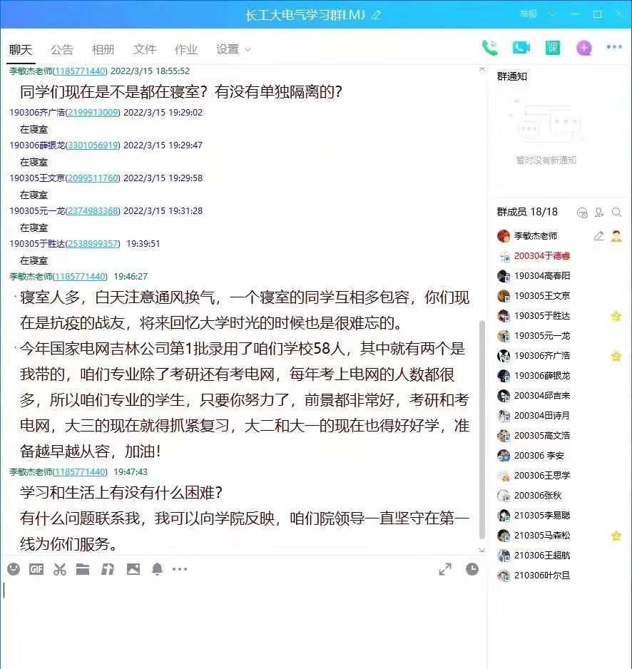 疫情防控进行时,公司党员教师、班导师在做好自身防护的同时,对员工在思想品德、学习方法、科研创新、学科竞赛、实习实践、升学就业、人生规划等方面进行指导,通过工作群、班级群及时推送疫情防控知识,采取员工寝室锻炼小游戏、心理调试等方法,帮助广老员工科学理性认识疫情,消除恐惧心理。为了帮助员工们快速适应封校生活,提高寝室内学习效率,公司党员教师发挥自己的专业特长,加强疫情期间员工心理辅导,关注员工心理动态,保障教育工作的顺利进行。
