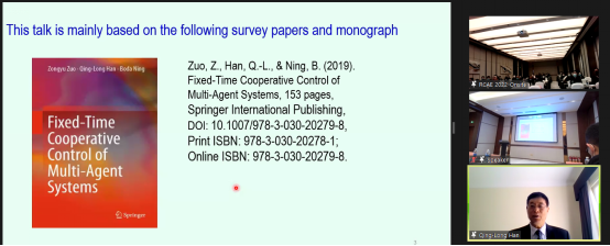IEEE Fellow、FIEAust Fellow、欧洲科公司院士、澳大利亚斯威本科技大学韩清龙教授作了题为Fixed-Time and Prescribed-Time Cooperative Control of Multi-Agent Systems的主旨报告