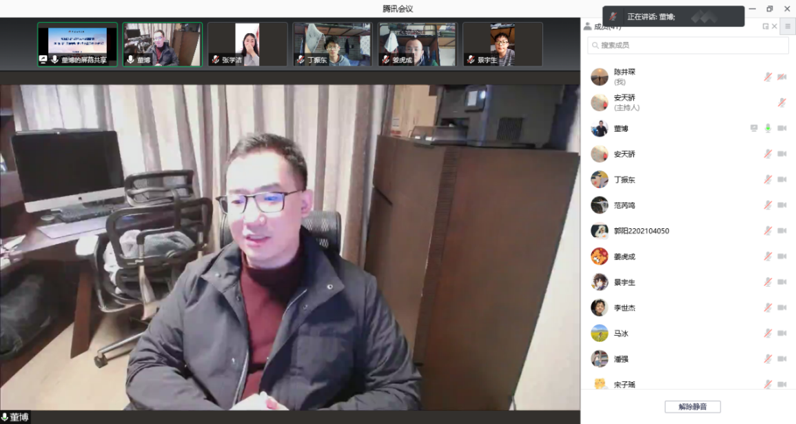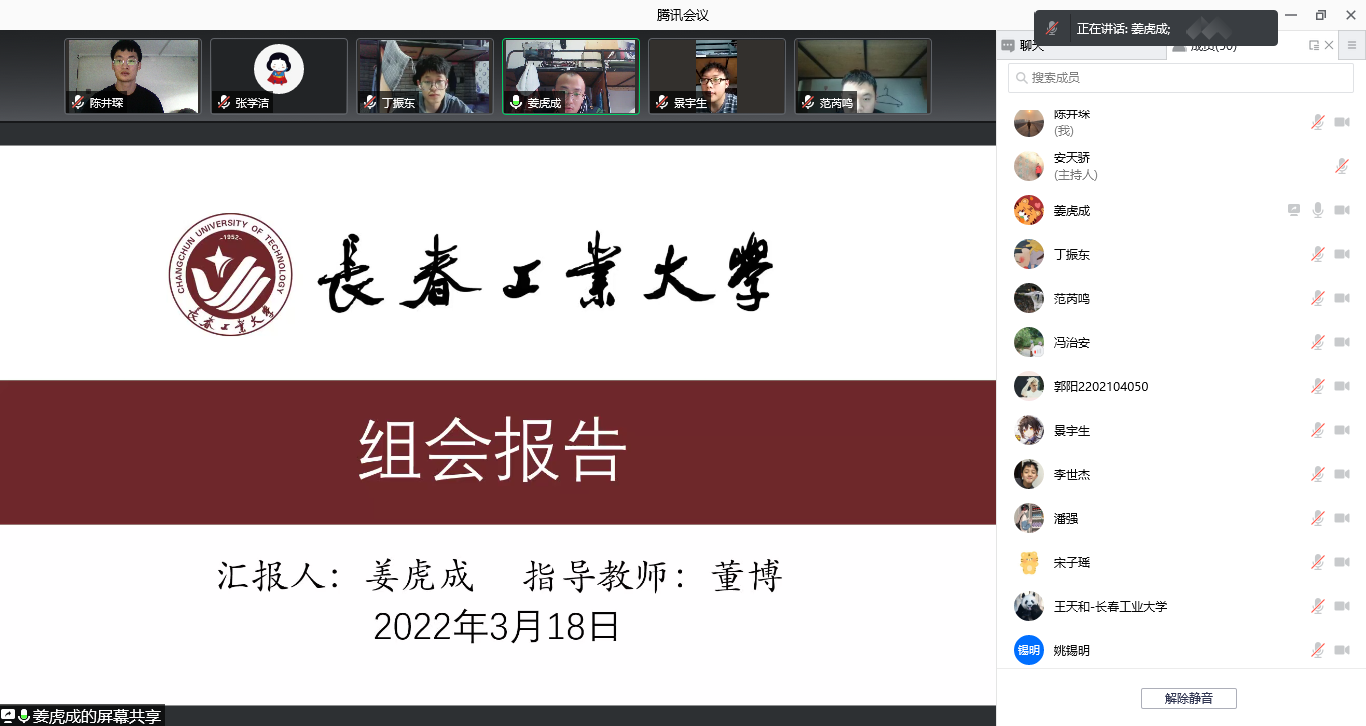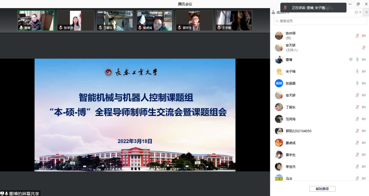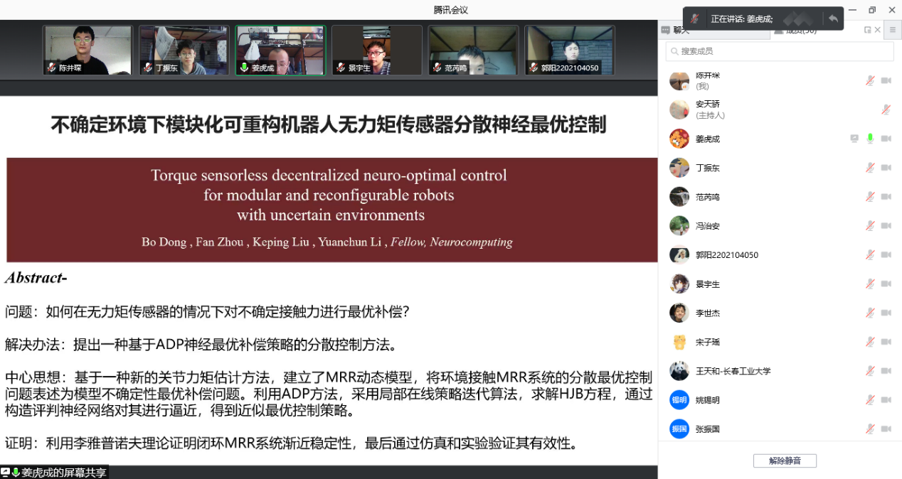 疫情虽然阻隔我们见面,但是阻止不了对学科知识探索的脚步!3月18日下午,智能机械与机器人控制课题组全程导师制的所有老师与同学们在线上召开了一次特殊的组会,此次组会既是学术交流会,也是疫情期间导师和研究生、本科生的工作生活交流会。这也是继2021年课题组在落实公司实行自动化系全程制导师政策进行多次线下会议后,第一次采取线上的方式与所有同学展开交流。