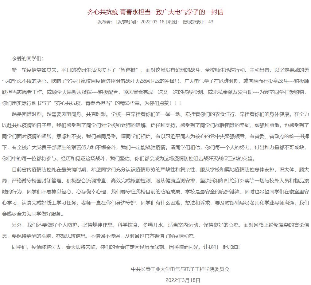 首先,董博教授宣读公司党委“齐心共抗疫青春永担当”的主题信件,在信件中公司党委赞扬广大电气学子在疫情危难时刻,向险而行投身战斗,积极踊跃担当志愿者工作,所有师生听从指挥--积极配合,顶风冒雪完成一次又一次的核酸检测,用实际行动书写了“齐心共抗疫、青春勇担当”的精彩华章。希望同学们在省内疫情防控的关键时期,服从公司和属地疫情防控总体安排,严格遵守校园封闭管理、积极配合流调排查,高效完成核酸检测,服从健康监测安排,坚决抵制和杜绝订外卖等一切与校外人员和物品接触的行为,同学们不要掉以轻心,心存侥幸心理,我们要守住公司目前的防疫成果,公司是最安全的庇护港湾。提醒同学们做好防护,坚持规律作息,科学饮食、多喝开水、适当室内运动,保持良好的心态,不信谣不传谣。